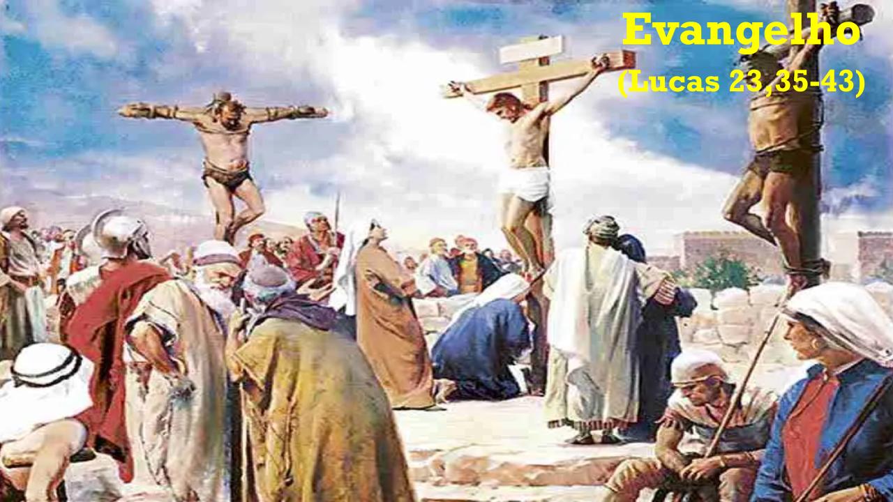 Proclamação do Evangelho de Jesus Cristo segundo Lucas –  Naquele tempo, 35os chefes zombavam de Jesus, dizendo: “A outros ele salvou. Salve-se a si mesmo se, de fato, é o Cristo de Deus, o escolhido!” 36Os soldados também caçoavam dele; aproximavam-se, ofereciam-lhe vinagre 37e diziam: “Se és o rei dos judeus, salva-te a ti mesmo!” 38Acima dele havia um letreiro: “Este é o rei dos judeus”. 39Um dos malfeitores crucificados o insultava, dizendo: “Tu não és o Cristo? Salva-te a ti mesmo e a nós!” 40Mas o outro o repreendeu, dizendo: “Nem sequer temes a Deus, tu que sofres a mesma condenação? 41Para nós é justo, porque estamos recebendo o que merecemos; mas ele não fez nada de mal”. 42E acrescentou: “Jesus, lembra-te de mim quando entrares no teu reinado”. 43Jesus lhe respondeu: “Em verdade eu te digo, ainda hoje estarás comigo no paraíso”.