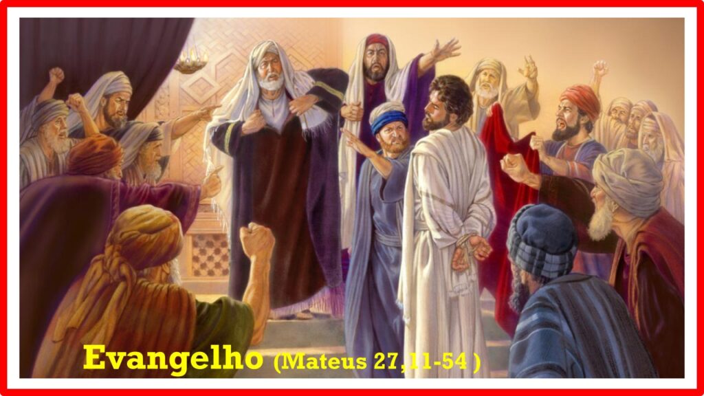N (Narrador): Paixão de nosso Senhor Jesus Cristo segundo Mateus – Naquele tempo, 11Jesus foi posto diante de Pôncio Pilatos, e este o interrogou: L (Leitor): Tu és o rei dos judeus? N: Jesus declarou: P (Presidente): É como dizes. N: 12E nada respondeu, quando foi acusado pelos sumos sacerdotes e anciãos. 13Então Pilatos perguntou: L: Não estás ouvindo de quanta coisa eles te acusam? N: 14Mas Jesus não respondeu uma só palavra, e o governador ficou muito impressionado.